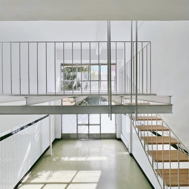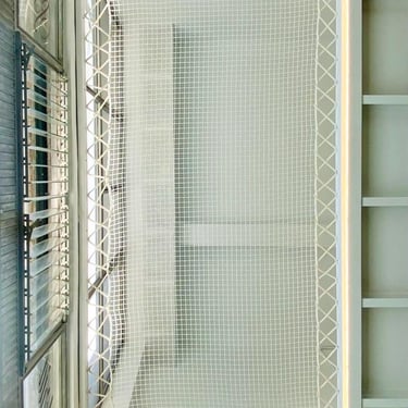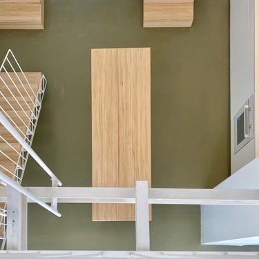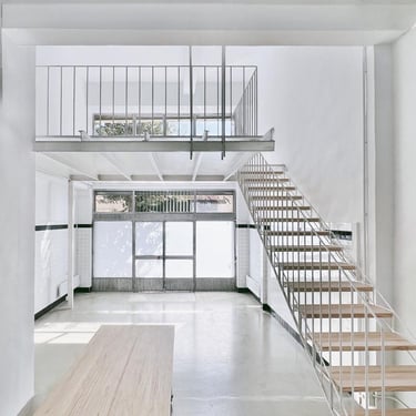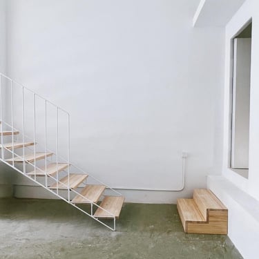 In addition to serving as an exhibition space, The Bakery features an open-plan layout with a fully equipped kitchen, a bright living area, a cozy bedroom, and a loft-style second bedroom, combining comfort and functionality. Guests can also relax on the suspended mesh floor, which overlooks the space below and a tree-lined window.