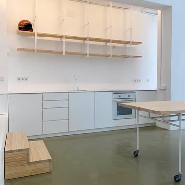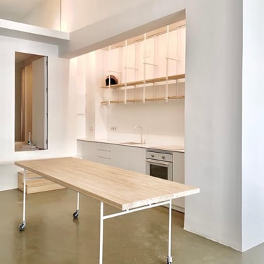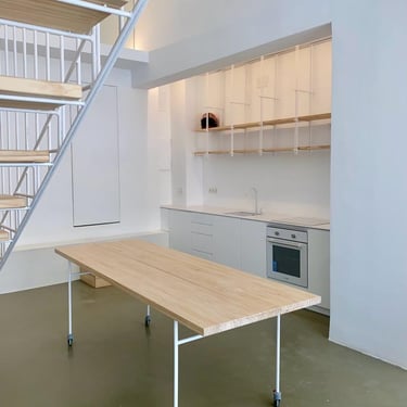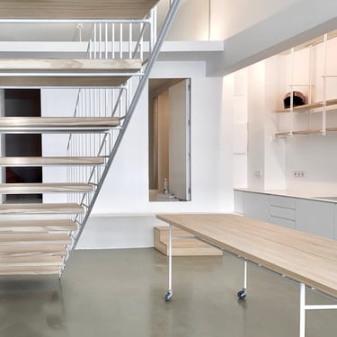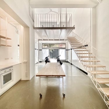 Located on the ground floor of a historic building, this former bakery has been transformed into a thoughtfully designed loft that blends rustic charm with modern comforts. Original architectural elements, such as steel rods, stone walls and high ceilings, have been preserved and paired with contemporary design to create a unique and inviting space.